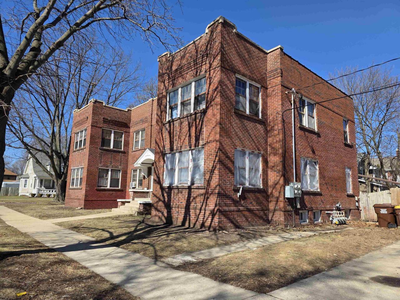 Corner location with a 4 unit residential apartment building, 2 car garage and fenced yard. All apartment units are occupied. Tenants pay their own natural gas and electric bills! The basement includes 4 utility rooms, each with a gas furnace, gas water heater, and electric circuit breaker box. Property owner pays water, garbage removal and sewer fees. 2 seperate parcels are included. Property to be sold AS IS.